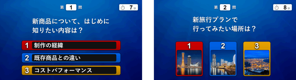 自身のタイミングで質問や分布を表示できるので、プレゼンの進行に合わせてご利用ください。